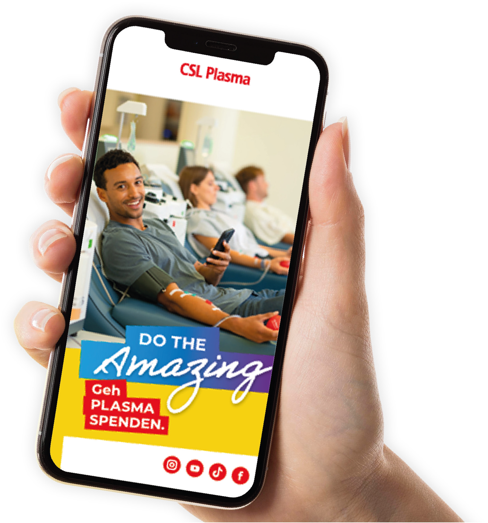 Hol dir die Mein CSL Plasma App und mach direkt einen Termin für die Anmeldung. Dort findest du auch einen ersten Check über deine Eignung als Plasmaspender.